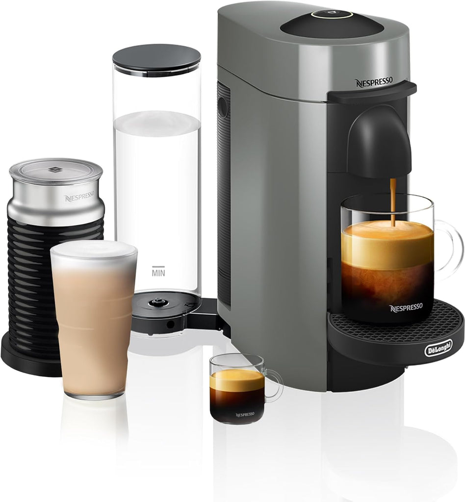 La Nespresso VertuoPlus prépare 4 tailles (café 5oz/8oz, espresso simple/double) d'un bouton. Inclut capsules Vertuo starter. Technologie Centrifusion™ lit code capsule pour paramètres parfaits. Plateau réglable, réservoir 1,2L, éjecte 10 capsules, chauffe 15-20s, arrêt auto 9min.